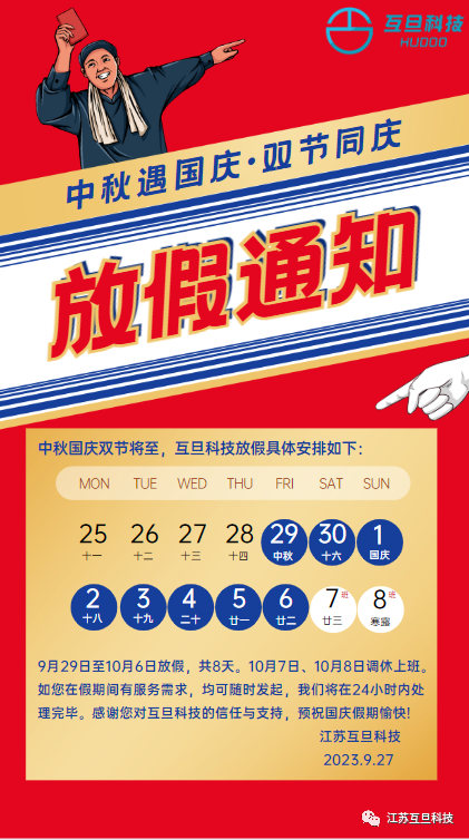互旦科技将执行9月29号-10月6号国庆休假,10月7-8号调休上班。不过即使放假,互旦科技也会安排好假期工作,各对接群和负责人不变,责任终身,明确担当,能扛事不推脱,假期内您如果有任何需求,我们都会在24小时内处理完毕!