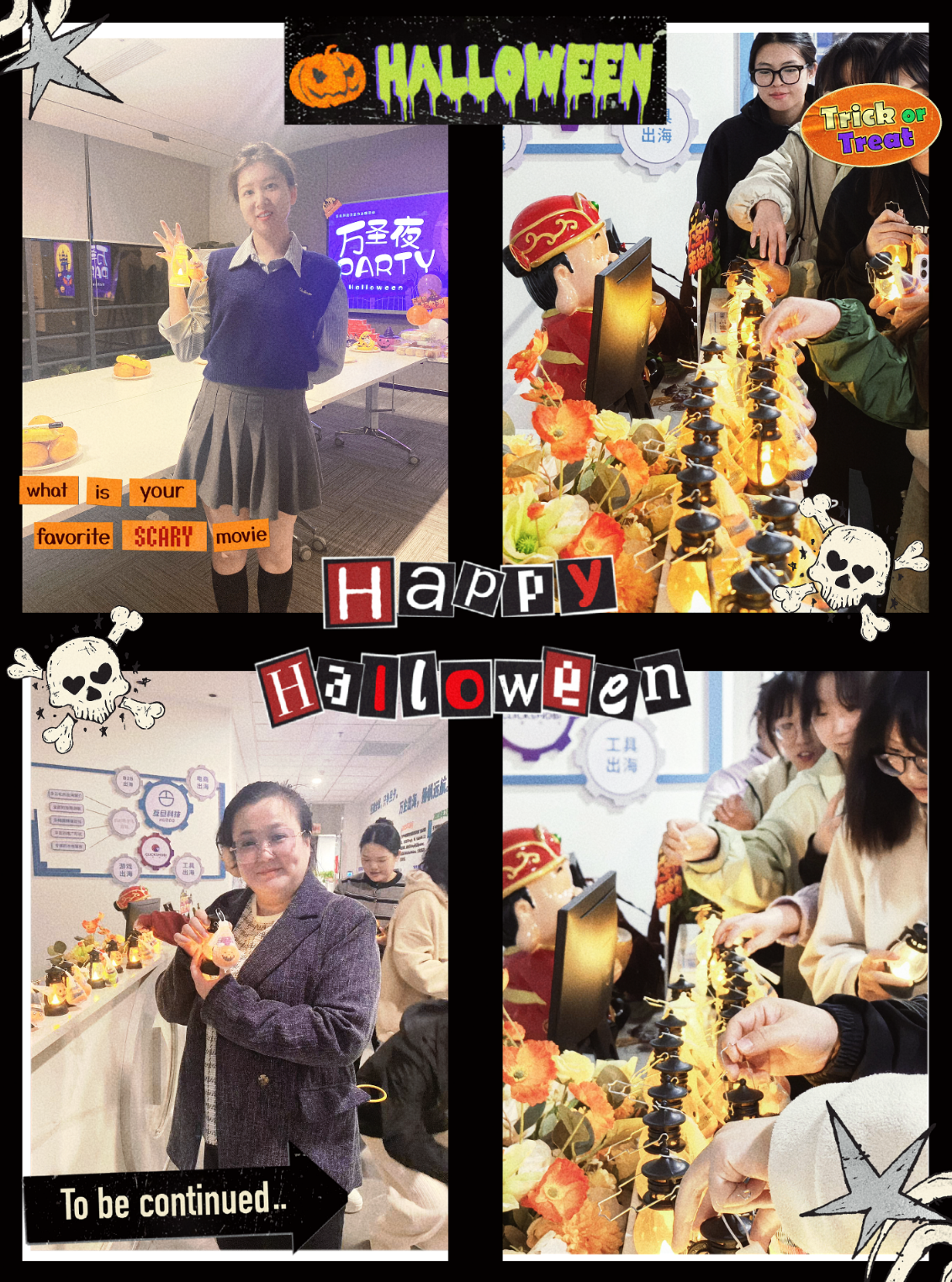 当夜幕降临的时候,公司贴上了蝙蝠、幽灵等节日装饰,被布置得焕然一新~