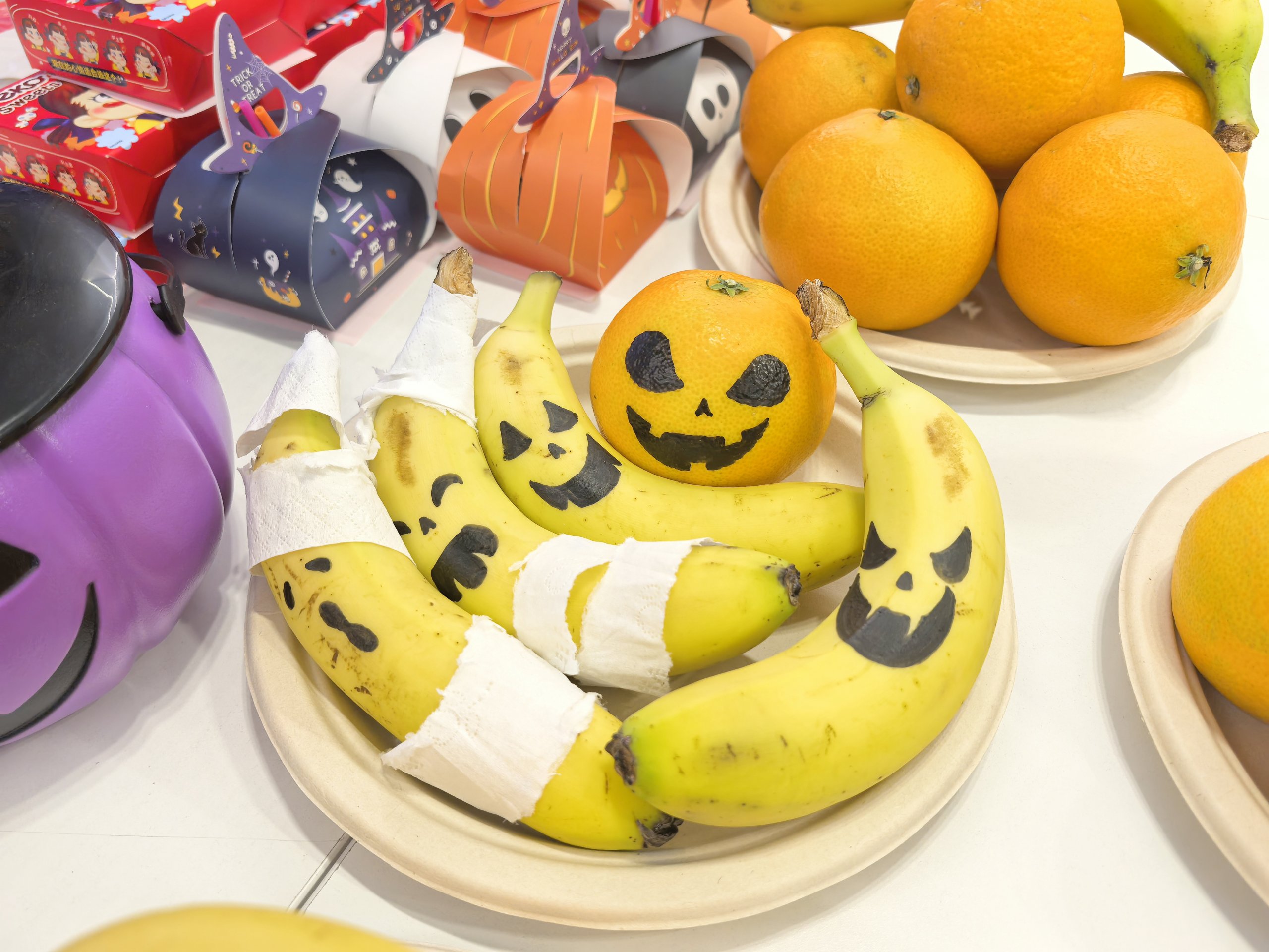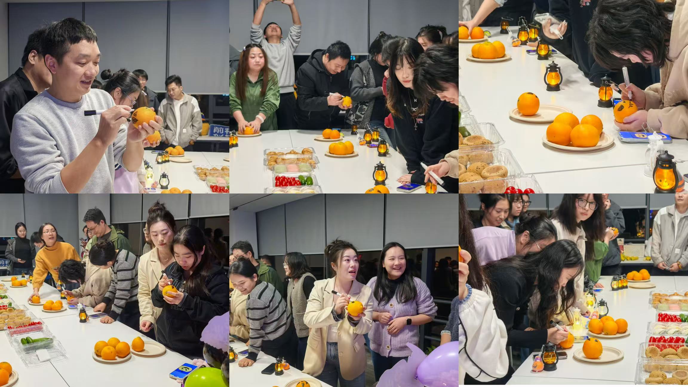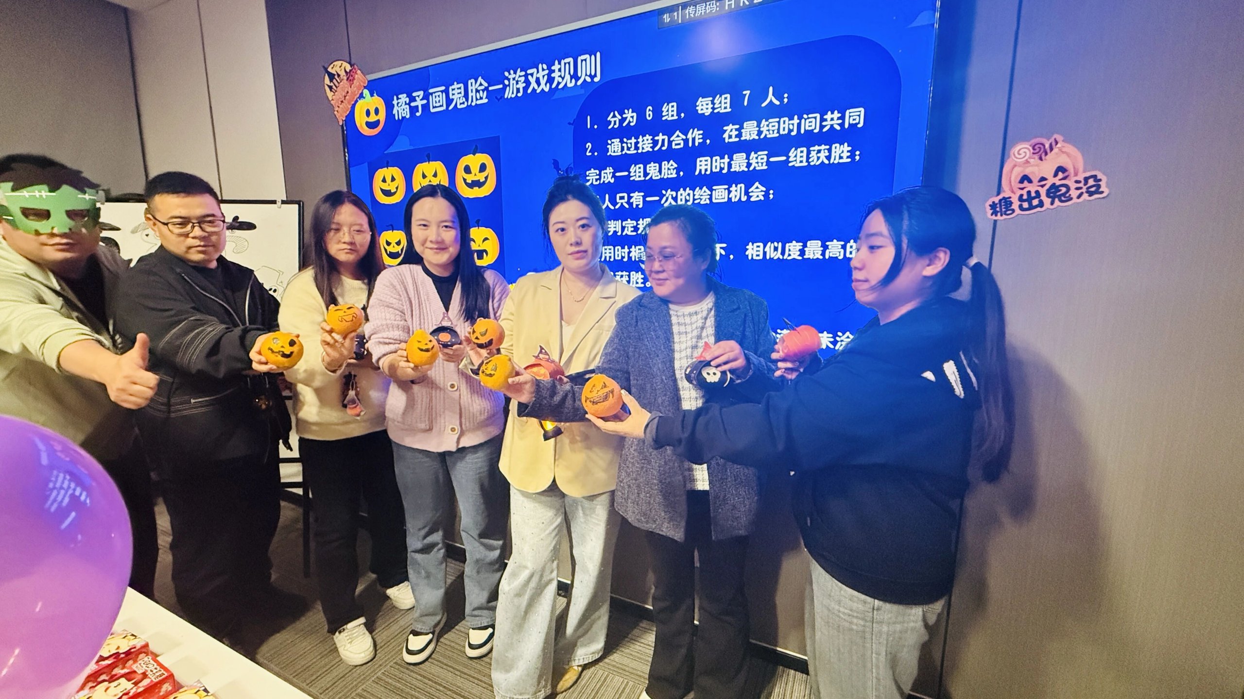 游戏很简单,团队比赛,小组接力给盘子里的桔子按规定图案画鬼脸装扮,最快且完成度最高的小组胜利!每人精美小礼物一份!