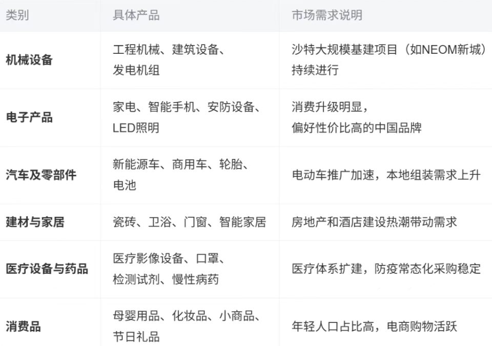 随着 NEOM、Qiddiya 等标志性大型项目进入 2026 年交付关键期,沙特对智能安防、绿色建材、自动化机械的需求迎来爆发式增长,且这类需求高度适配中国企业的供应链优势。