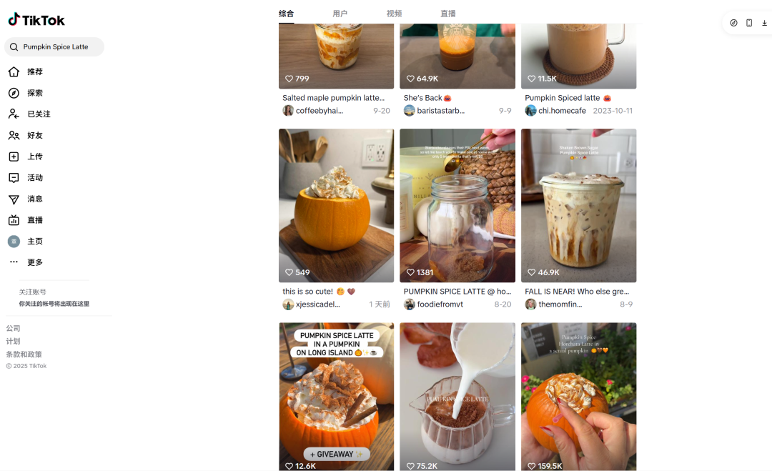 今年,南瓜拿铁在 TikTok 上的热度再次被点燃。光是话题讨论度就超过两百万,相关视频播放量更是突破了十亿次。它早已不仅仅是一杯饮品,而是一种文化现象。年轻人会拿它打卡发帖,品牌会借此推出联名,甚至很多人会围绕“秋天的第一杯”讲述自己的生活方式。