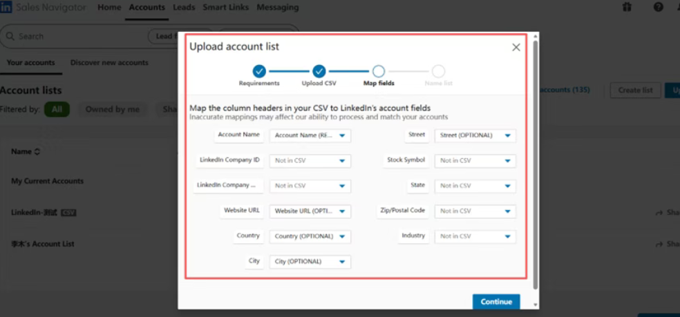 你可以把已经整理好的 公司清单(Account List) 直接导入 LinkedIn。这些公司名单可以来自 CRM、过往客户、展会名录,甚至是第三方数据库。只要包含公司名称、官网、城市或地区等基础信息,LinkedIn 就能自动在自己的数据库中进行匹配,判断这些公司是否拥有可用的企业主页。