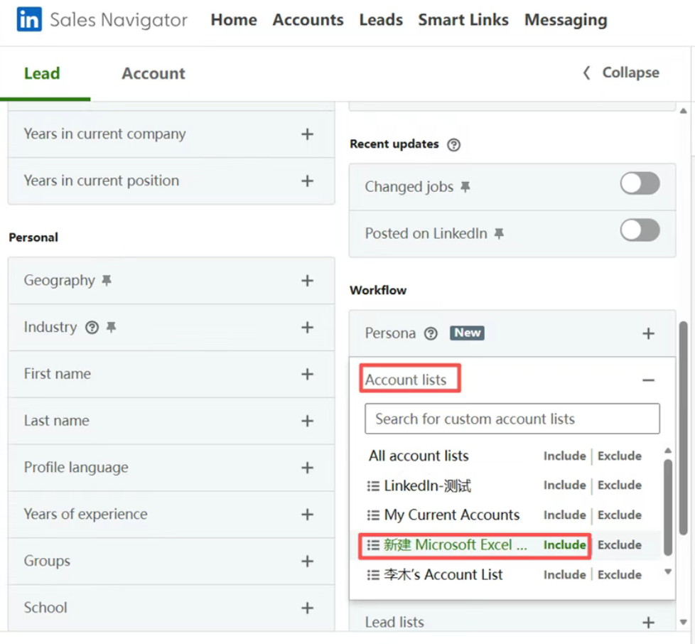 进入潜在客户筛选器后,你可以把刚刚整理好的公司列表导入系统,Sales Navigator 会帮你匹配出这些公司的在职人员。接下来,利用职位、职能、级别、地区等条件,逐步缩小范围。比如,你想找销售总监、采购经理、技术负责人,甚至是 CEO 或创始人,都可以精准筛选。