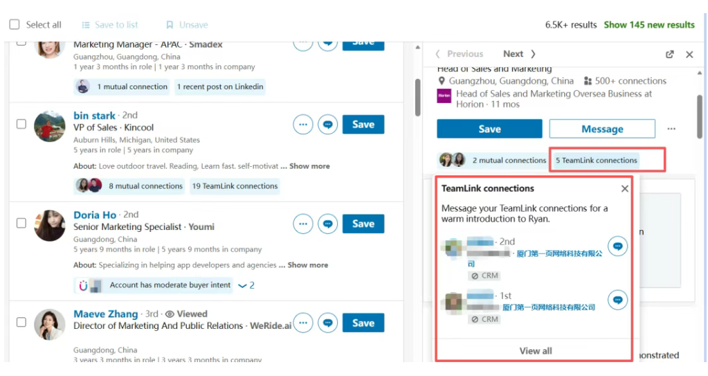 TeamLink会提示你,客户是否与你的同事存在一度或二度关系。。很多时候,你自己是冷的,但团队关系是热的。通过内部引荐,不仅能提高回复率,也能避免团队内部重复跟进同一客户。