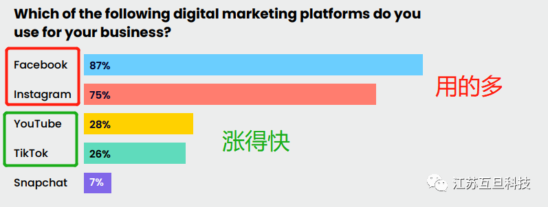 据国外数据机构统计,对于美国本土的企业而言,FB(含Ins)是目前商家用的最多的社媒渠道,但是YouTube和TikTok 是增长较快的社媒。Snapchat排名第五流量不算很大。
